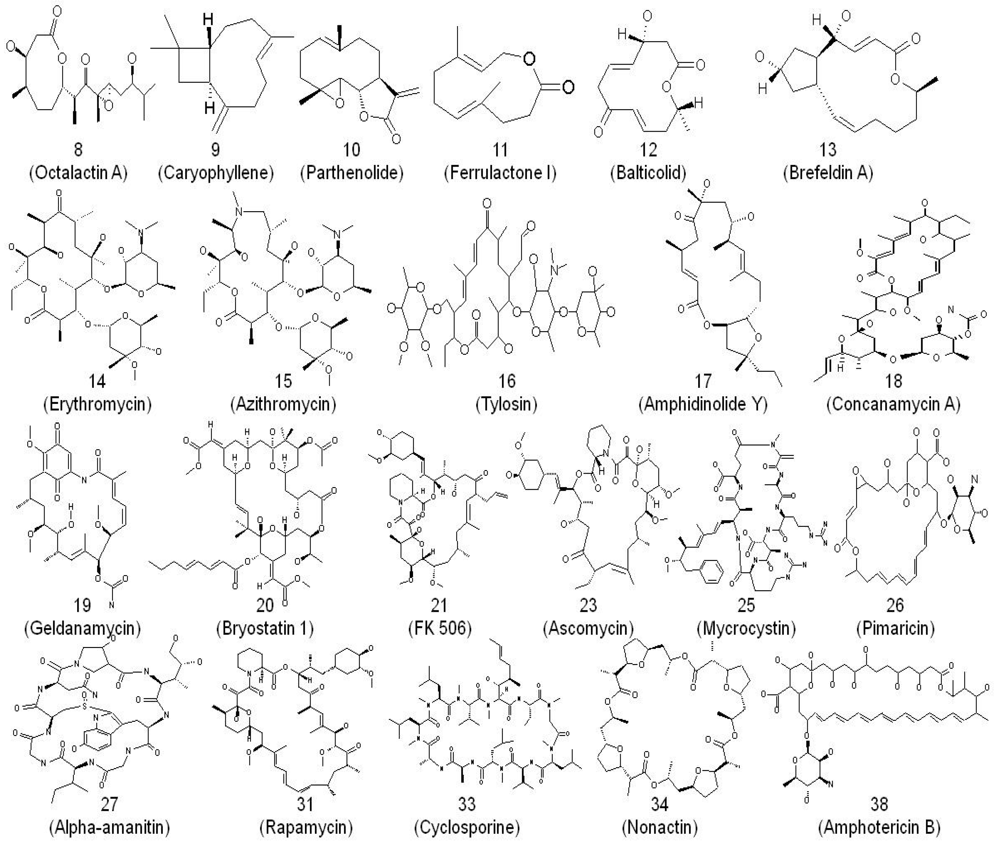Examples of macrolide diversity [31], where macrocyclic ring lactones vary in size from eight-membered up to 62-membered rings. Numbers indicate the size of the ring.