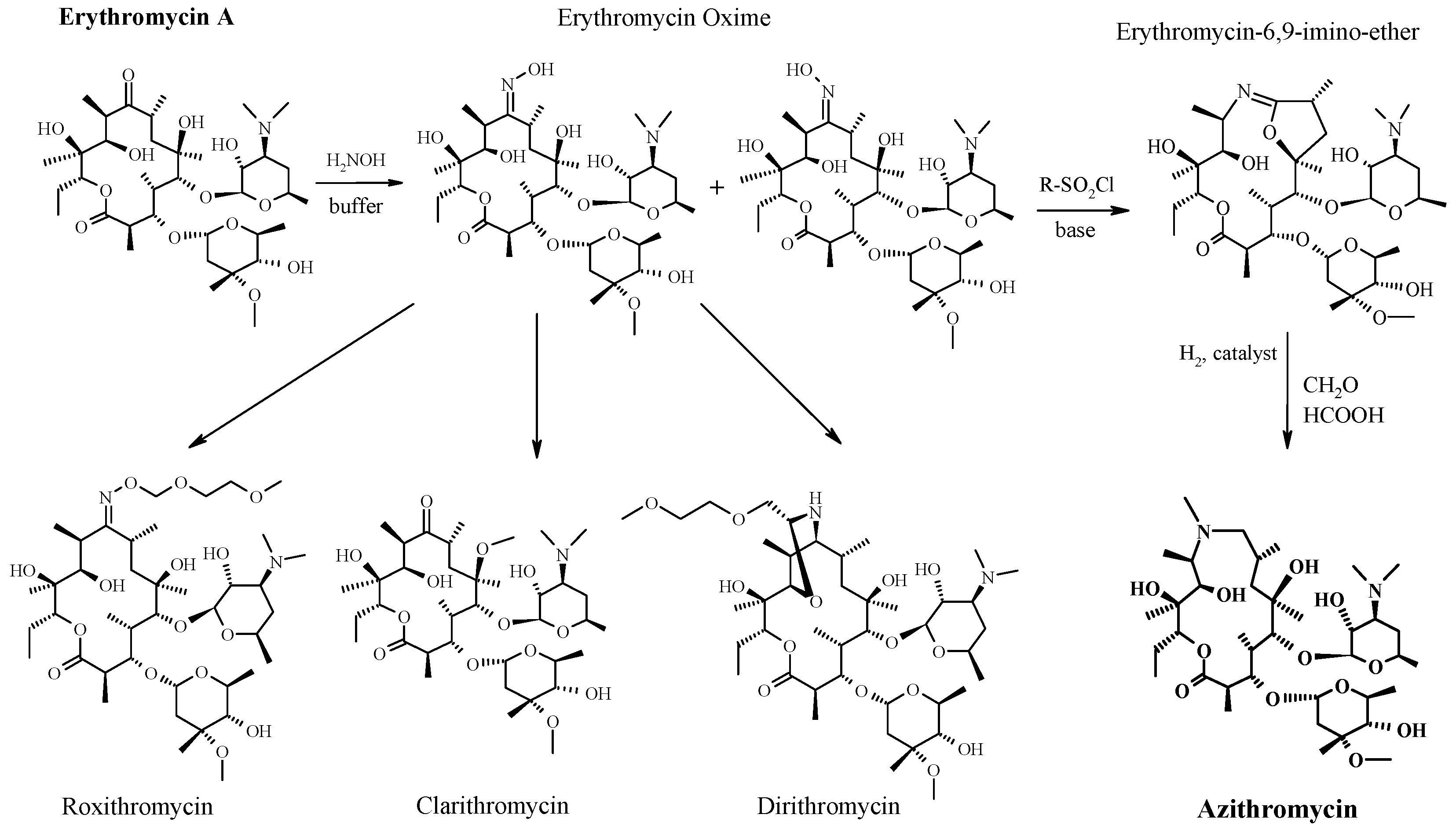 From Erythromycin A to other macrocyclic antibiotics (roxithromycin, dirithromycin, clarithromycin, etc.), including azithromycin, a “blockbuster” anti-infective drug [31].