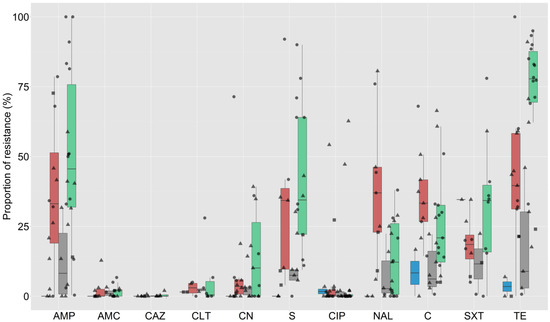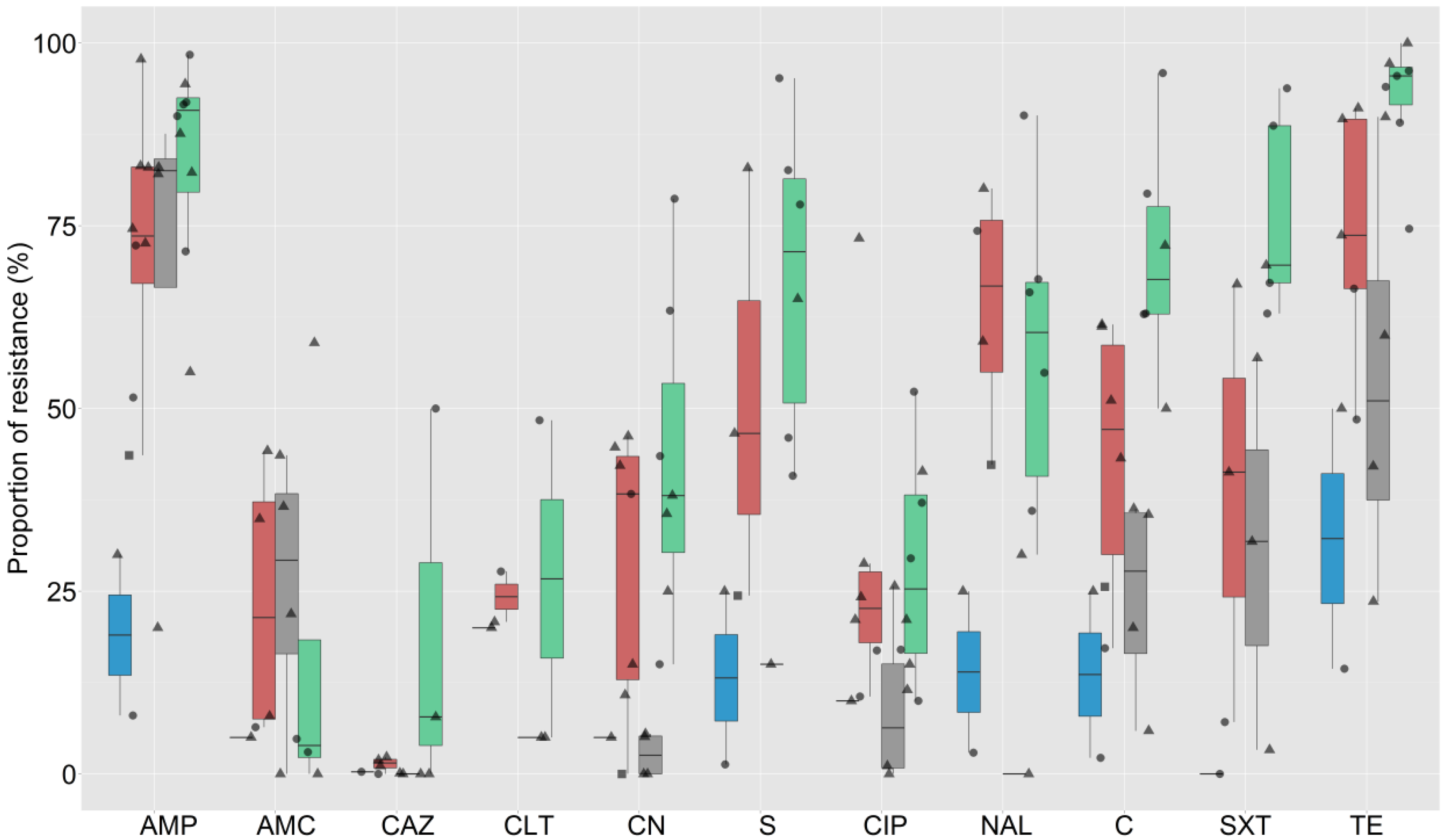 Summary results of estimates of prevalence of AMR in non-typhoidal Salmonella (NTS) isolates of animal origin (N = 41). Blue = aquaculture, Red = chicken, Green = pig, Grey = other species. Circle = Thailand, triangle = Vietnam, square = other countries (Cambodia, Lao PDR, and Malaysia). Key: AMP = ampicillin, AMC = augmentin, CAZ = ceftazidime, CLT = cephalothin, CN = gentamicin, S = streptomycin, CIP = ciprofloxacin, NAL = nalidixic acid, C = chloramphenicol, SXT = co-trimoxazole, TE = tetracycline. Boxplots indicate median and 75% interquartile range.