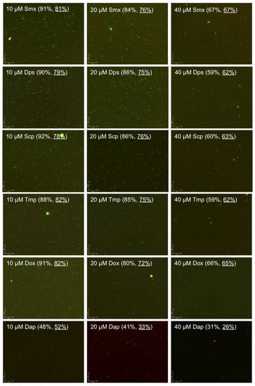 We found a dose-dependent increase in the killing activity of the three sulfa drugs and trimethoprim against the stationary phase B. burgdorferi, resulting in 59%–67% residual viability (Figure 1) at the highest concentration (40 µM). Dapsone, sulfachlorpyridazine and trimethoprim showed very similar activity against stationary phase B. burgdorferi with the 59%, 60% and 59% residual viability, respectively, at 40 µM; however, sulfamethoxazole was the less active drug among the three sulfa drug and trimethoprim as shown by 67% residual viability after the drug treatment for seven days (Figure 1). Meanwhile, we observed that dapsone, sulfachlorpyridazine and trimethoprim showed better activity than the doxycycline control (residual viability 66%) at the high concentration (40 µM). However, the three sulfa drugs and trimethoprim still could not eradicate stationary phase B. burgdorferi even at 40 µM. After the seven-day drug treatment of sulfamethoxazole, dapsone, sulfachlorpyridazine and trimethoprim, we could still find many green (live) B. burgdorferi cells in aggregated microcolony form, round body form and spirochetal form under the microscope revealed by the SYBR Green I/PI viability assay (Figure 1). As shown in our previous studies [13,14,18], daptomycin showed impressive activity (residual viability 31%) against stationary phase B. burgdorferi at 40 µM, as shown by mostly red (dead) cells and red microcolonies (Figure 1). Although dapsone, sulfachlorpyridazine, and trimethoprim showed better activity than doxycycline at 40 µM, their activity is relatively weak compared to daptomycin. We also noticed that sulfamethoxazole showed the weakest activity (residual viability 67%) among the sulfa drugs evaluated and is close to the activity of doxycycline (residual viability 66%) at the high concentration (40 µM).