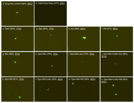 Dapsone improved chronic Lyme disease/PTLDS patients’ clinical symptoms in a recent study [20]. To identify more effective dapsone drug combinations that kill B. burgdorferi stationary phase cells, we tested some dapsone drug combinations with clinically used antibiotics (cefuroxime, azithromycin, rifampin and minocycline). The plate reader results were also confirmed with the microscope counting after SYBR Green I/PI viability staining (Figure 2). The results showed that some drug combinations (Figure 2h–n) were indeed much more effective than single drugs (Figure 2c–g). Dapsone (residual viability 84%, Figure 2d) showed slightly better activity against the seven-day-old stationary phase culture (residual viability 93%, Figure 2a) than the other three clinically used antibiotics azithromycin (residual viability 88%, Figure 2e), rifampin (residual viability 87%, Figure 2f) and minocycline (residual viability 86%, Figure 2g). Both two-drug combinations dapsone/minocycline and dapsone/rifampin showed better activity, with 78% and 81% residual viable (green) cells (Figure 2h,k) remaining, respectively, in comparison to the single drugs (residual viability 84%–87%, Figure 2d,f,g). Interestingly, when cefuroxime was added to the drug combination dapsone/rifampin, the anti-persister activity of these compounds was markedly increased as shown by the 65% residual viable cells remaining (Figure 2l), compared to the dapsone/rifampin combination (residual viability 81%, Figure 2k). We also noted that rifampin/dapsone/minocycline showed better cooperative activity (residual viability 66%, Figure 2m) than the azithromycin/dapsone/minocycline combination (residual viability 72%, Figure 2i), indicating rifampin is more important than azithromycin in combination with dapsone and minocycline. Not surprisingly, the four-drug combinations were more active (residual viability 58% and 60%, Figure 2j,n) than the three-drug combinations (residual viability 65%–72%, Figure 2i,l,m). However, in contrast to the three-drug combination, azithromycin combined with dapsone/minocycline/cefuroxime was slightly more active (residual viability 58%, Figure 2j) than the rifampin four-drug combination (rifampin/dapsone/minocycline/cefuroxime, residual viability 60%, Figure 2n).