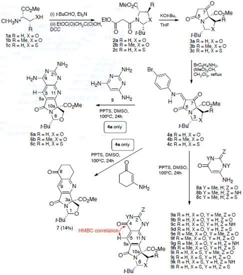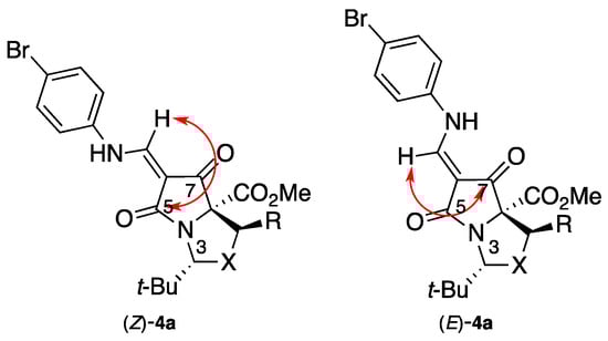 Our approach began with tetramates 3a–c, which we have reported previously, to be available in enantiopure form from the esters of serine 1a, threonine 1b, and cysteine 1c (Scheme 1) [,]; this outcome arises as a result of the selective formation of cis-oxa(thia)zolidines 2a–c, which chemoselectively cyclise to the product tetramates under basic conditions. Reaction of each of these with trimethyl orthoformate and para-bromoaniline (using a protocol which has been recently reported []) gave the corresponding enamines 4a–c; these were obtained as E/Z mixtures, and the identity of the major one as Z was established by dihedral-angle-dependent coupling constants [] from HMBC NMR experiments; thus, the intensity of the coupling between the exocyclic vinylic proton and C-5 is greater than that with C-7 in major product (Z)-4a, and vice versa in the minor product (E)-4a, clearly indicating the double bond geometry in each case (Figure 1).