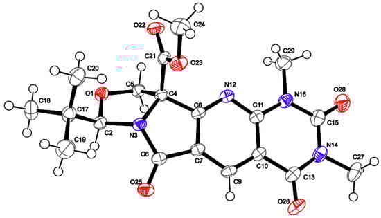 When this reaction was applied to 3-aminocyclohex-2-enone with tetramate 4a, the corresponding product 7 was obtained in only 5% yield, which could be improved to a maximum of only 14% yield by using DMSO at 100 °C for 24 h under acid catalysis with PPTS, but of interest is that other acyclic enamine systems (3-aminocyclopent-2-en-1-one, (Z)-3-amino-1,3-diphenylprop-2-en-1-one, 2-aminocyclohexa-2,5-diene-1,4-dione) gave no product. Extension of this approach to other enamine-containing systems, aminopyrimidines 8a-c, which have previously found application in annulation processes with enamines [], gave the corresponding annulated products in modest to good yield in some cases (Table 1). The serine-derived system 4a gave best yields (9a–d), and interestingly the directly related threonine-derived system reacted poorly or not at all (9e-h), and this presumably reflects the hindrance to reaction imposed by the C-10 methyl group over the endo-face of the tetramate ring. The cysteine-derived systems (9i-j) behaved better, and aminopyrimidine with Z = O gave a higher yield than with Z = NH, while 9l (Z = S) gave a poor yield and could not be obtained in pure form. In the NMR spectra, similar δH-10 values in the compound series were strongly suggestive of similar structure; HMBC experiments also showed strong coupling between H-5 and C-4, supporting the formation of the proposed structure rather than alternative regioisomeric products. In the case of N-Me derivative 9a, the structural assignment was further confirmed from single crystal X-ray analysis (Figure 2).