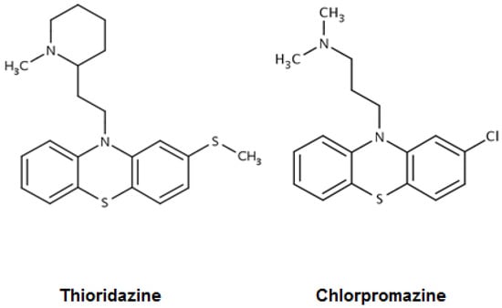 Structures of the phenothiazines thioridazine and chlorpromazine [].