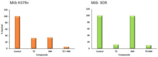 Killing effect of thioridazine over three days of infection. Effect of thioridazine on the intracellular survival of M. tuberculosis (Mtb) H37Rv and an XDR Mtb strain within human monocyte-derived macrophages at day three post infection. Isoniazid (INH) was tested at 0.1 µg/mL, and thioridazine (TZ) at 2.5 µg/mL. Data are presented as a mean of the percentage of the survival (adapted from []).