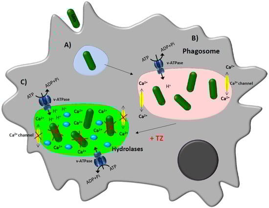 Schematic model proposed for the enhancement of the macrophage killing activity by thioridazine [,,,,]. Infected macrophage. (A) The bacterium is recognized by receptors present on the plasma membrane of the macrophage and is internalized by invagination of the plasma membrane into a phagosome; (B) Once the phagosome is formed, the bacteria will manipulate the immune response, leading to the reduction of the availability of calcium within the phagosome, preventing the process of acidification needed for the activation of the hydrolases and the bacteria are thus not killed; (C) Treatment of infected-macrophages with Ca2+/ion channel blockers such as thioridazine (TZ) will increase the concentration of calcium into the cytoplasm and the transcription and activity of vacuolar proton (H+)-ATPases. This rise of protons causes the decrease of the pH in the phagolysosome, activating hydrolases that consequently kill the mycobacteria.