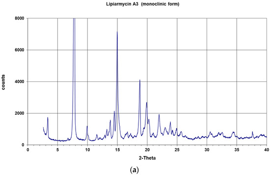 X-ray powder diffraction (XRPD) diagrams of crystalline fidaxomicin: (a) lipiarmycin A3 (monoclinic phase); (b) tiacumicin B (triclinic phase). For details of the two crystalline phases, see text.