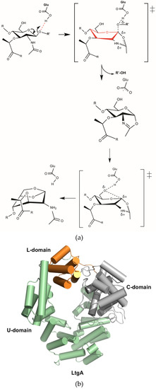 (a) Proposed catalytic mechanism of lytic transglycosylases (Lts). Lts use a single catalytic glutamate or aspartate in a simple acid and then base catalysis. In the absence of a second catalytic residue in the active site, these enzymes proceed via anachimeric assistance of the N-acetylmuramic acid (MurNAc) 2-acetamido group and formation of the oxazolinium ion intermediate [31]; (b) Overall structure of LtgA. LtgA has three domains: U (green), L (orange) and C (grey). Structure is displayed in a front view. The helices are represented as cylinders.
