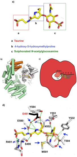Bulgecin A consists of a 4-O-sulfonyl-N-acetylglucosamine moiety that is linked by a β 1-4 glycosidic linkage to a 4-hydroxy-5-(hydroxymethyl)-l-proline (Figure 2a) that terminates with a taurine (N-linked sulfur) moiety. The density for the complete structure of bulgecin A is clear and consistent in the active site of LtgA (Figure S2). Bulgecin A is bound in the region of the active site defined as subsite −1, −2, −3, and partially occludes subsite +1 (Figure 2b,c). The inhibitor is perfectly poised to block the PG glycan strand. An alignment of LtgA catalytic domain with Slt70, MltE, and MltC demonstrates absolute conservation of the active site of LtgA (Figure S3). A docked chito-oligossacharide (chitopentaose) in the active site of LtgA mimics the PG glycan strand (Figure S4). In the active site of LtgA, chitopentaose and bulgecin A have overlapping binding sites (Figure 2b–d and Figure S4). This strongly suggests that bulgecin A could be competitive with the PG glycan strand. The 4-O sulfonated group of the GlcNAc residue forms hydrogen bonds through a well-defined solvent model that was not observed in the Slt70-bulgecin structure, because this complex was at a lower resolution (2.8 angstroms) [35] (Figure 2d). The sulfate partially occludes subsite −3 that would block access to the LtgA active site and possibly contribute to the dose-dependent inhibition of bulgecin A. The O42 hydroxyl of the sulfur makes an indirect interaction via a water molecule with T504, and is the primary contact of the sulfur group with the active site of LtgA. The sulfate is bound to two additional water molecules that form a continuous network of hydrogen bonds in the active site. These water molecules surrounding bulgecin A in the active site of LtgA potentially contribute to inhibitor stability and efficacy and may be important in substrate binding and catalysis (Figure 2d). There are five water molecules that are in direct contact with bulgecin A. Three are involved in water-mediated interactions with residues in the active site of LtgA.