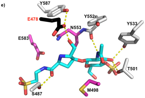 (a) Bulgecin A, a sulphonated N-acetyl-d-glucosamine unit linked to a 4-hydroxy-5-hydroxymethylproline ring by a β-glycosidic linkage. Crystal structure of LtgA in complex with bulgecin A at 1.78 angstroms; (b) Domain organization of LtgA in which the helices are represented by cylinders, and the active site residues are illustrated in a stick model. Active site residues are mainly colored in grey and catalytic residue in black for contrast. Bulgecin A is colored in yellow. In this front view, bulgecin A (yellow) is binding in the putative active site of LtgA; (c) Schematic of bulgecin A in the active site of LtgA; (d) Noncovalent interactions between bulgecin A and conserved residues in the active site of LtgA (Figure S2 alignment). Water molecules are represented by red spheres and further highlighted with blue arrows; (e) Close-up of the active site of bulgecin A in the active site of Slt70. For contrast to Figure 2d, bulgecin A is colored in blue. Conserved residues that are making interactions in the LtgA-bulgecin A complex are colored in pink. In the soluble lytic tranglycosylases (Slt)70-bulgecin A complex a solvent model is undefined because it is at lower resolution 2.8 angstroms [35].