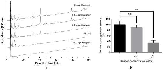 Inhibition of LtgA activity by Bulgecin A. (a) Reversed-phase (RP)-HPLC analysis of muropeptides released by LtgA digestion in the presence or absence of bulgecin A (0 μM, 9 μM, and 90 μM); (b) Proportion of muropeptides released in the presence of bulgecin A relative to that released in the uninhibited reaction. ** p < 0.01 (unpaired t-test).