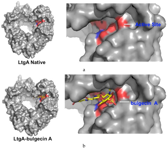 Surface model of LtgA native and LtgA in complex with bulgecin A. (a) Conserved residues that align the active site are highlighted in red; (b) Bulgecin A binds to the conserved active site groove.