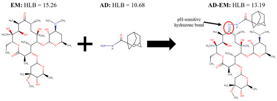Schematic of the chemical structure and synthesis of adamantane-modified erythromycin (AD-EM). In the synthesis of AD-EM, adamantane (AD) is chemically linked to EM via a pH-sensitive hydrazone bond (C = N) at the site of the C-9 primary ketone on EM.
