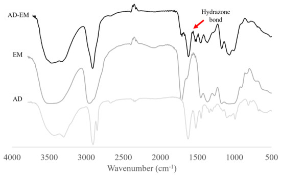 FTIR spectra were generated for AD, EM, and AD-EM from 500–4000 cm−1. The spectra were superimposed upon one another in order to evaluate whether the hydrazone bond was successfully created between AD and EM. The formation of the hydrazone bond is indicated by a peak over the span of 1560–1570 cm−1 on the AD-EM spectrum that is not present on the other spectra [14,28]. Figure 2 depicts the appearance of the hydrazone peak (1560–1570 cm−1) on the spectrum of AD-EM validating the formation and presence of the hydrazone bond.
