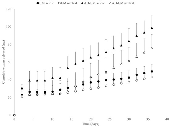 Cumulative mass of AD-EM and EM released in both acidic (pH 5.0) and neutral (pH 7.4) conditions.