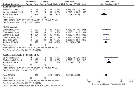 A strain-specific subgroup analysis combining data from eight of the included trials showed a similar protective effect of probiotics in the prevention of AAD when compared to the overall pooled analysis. The most effective probiotic strain was L. rhamnosus GG (RR 0.29; 95% CI 0.15 to 0.57; 307 participants), followed by S. boulardii (RR 0.41; 95% CI 0.30 to 0.57; 1.139 participants). Furthermore, with this subgroup analysis, the heterogeneity from the pooled analysis (I2 = 58%) disappeared in each of the three subgroups (I2 = 0%).