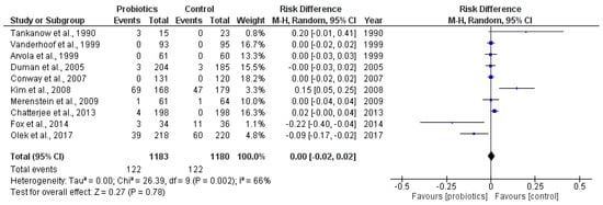 None of the 17 included studies specifically defined adverse events prior to enrolment of participants. Ten trials (N = 2363; Tankanow 1990, Arvola 1999, Vanderhoof 1999, Duman 2005, Conway 2007, Kim 2008, Merenstein 2009, Chatterjee 2013, Fox 2014, Olek 2017) reported the number of participants with adverse events in each group. Adverse events consisted of a variety of different symptoms such as metallic taste, nausea, loss of appetite, epigastric discomfort, headache, flu-like symptoms, rash, etc. There were no serious adverse effects leading to major disabilities, hospitalization, or death. Three trials (Kim 2008, Fox 2004, Olek 2017) found a statistically significant difference in adverse events between groups; one favors placebo and two favor probiotics. Kim et al. found a difference in the presence of metallic taste between the intervention group (16.7%) and the control group (7.3%). Fox et al., as well as Olek et al., reported more adverse events in their placebo-controlled patient group, and these were abdominal pain, loss of appetite, nausea, pyrexia, headache, and rash.