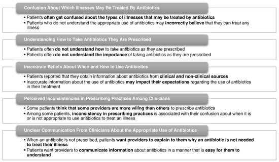 A thematic analysis of the semi-structured interview data identified the following barriers that patients face to improving their understanding of the appropriate use of antibiotics: confusion about which types of illnesses may be treated by antibiotics; understanding how to take antibiotics as they are prescribed; beliefs about when and how to take antibiotics that are informed by inaccurate information; inconsistent prescribing practices among clinicians; and unclear communication from clinicians about the appropriate use of antibiotics (Figure 1).