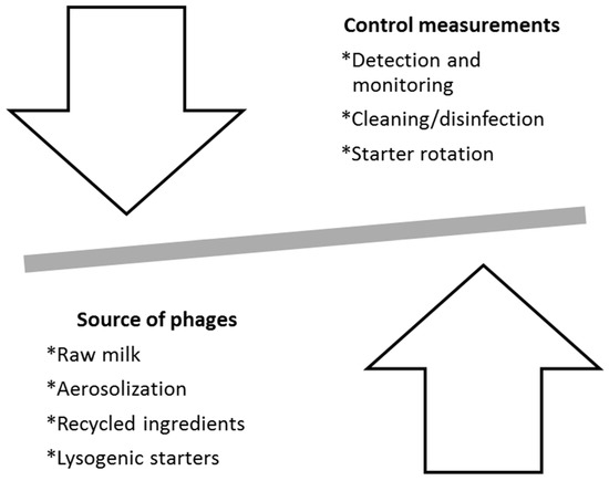 Phage infection of dairy starter cultures remains the main cause of fermentation failures in the dairy industry. Phage outbreaks can lead to substantial economic losses due to manufacturing delays, waste of ingredients, lower quality product, growth of spoilage and pathogenic microorganisms or even total production loss [12]. Close monitoring of entry routes, quick and effective phage detection methods and control measurements are currently applied to reduce the risk of phage propagation within dairy settings (Figure 1).