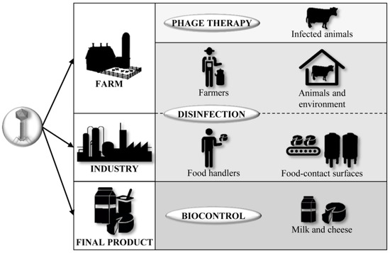 As we mentioned previously, foodborne diseases continue to be a hurdle for human health and those associated to dairy industries are not an exception. Thus, many pathogenic bacteria can spread along the food chain from “farm to fork”. In this regard, phages can be used as antimicrobials and biocontrol agents in food industries to prevent and control step by step the pathogenic bacterial contamination during food production (Figure 3). The use of phages has some advantages over conventional disinfectants such as their narrow host range, targeting specifically bacteria from one species or genus, being also effective against bacteria resistant to antibiotics. Moreover, phages have been described as safe for humans, animals, plants and the environment [79]. Besides, they do not cause equipment or surface damage or alter the organoleptic properties of food.