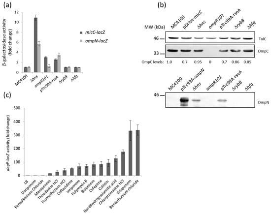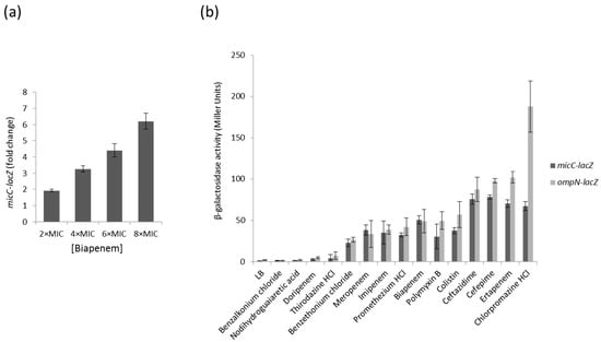 (a) Dose dependent micC–lacZ activity in presence of increasing concentrations of biapenem (MIC of 0.32 µg/mL); (b) β-galactosidase activity of the micC- and ompN-lacZ fusions in the presence of selected compounds. Values are means from three independent determinations, and standard deviation is represented.