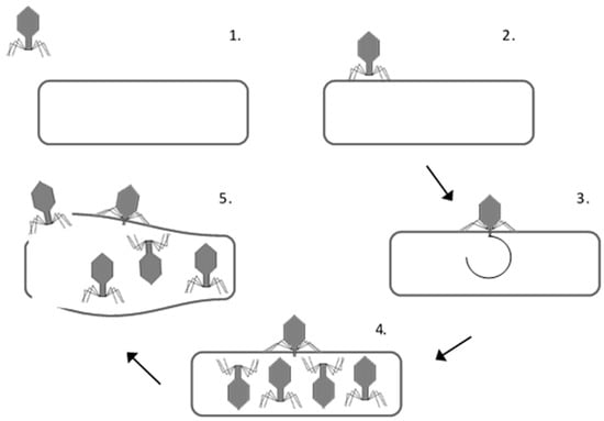 Life cycle of a virulent tailed phage (not to scale). (1) The phage collides with the bacterial cell; (2) the phage binds to cell receptors; (3) the phage is irreversibly bound and injects nucleic acid into the cell via the tail tube, where it is transcribed and translated; (4) many progeny phages are produced within intact cells; (5) endolysins degrade the host bacterial cell wall, which loses its structural integrity and ruptures due to the osmotic pressure, releasing the progeny phages.