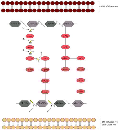 Diagram of the typical cell wall and peptidoglycan structure of bacteria, including the endolysin cleavage sites. The peptidoglycan is composed of repeating sugar units, N-acetylglucosamine (GlcNAc) and N-acetylmuramic acid (MurNAc), which are cross-linked via an interpeptide bridge between the meso-diaminopimelic acid (m-DAP) and d-alanine (d-Ala) residues of adjacent tetrapeptide chains. The chains also contain L-alanine (l-Ala) and D-glutamic acid (d-Glu). Gram-negative bacteria contain an outer membrane (OM) structure not present in Gram-positive bacteria. Both contain an inner membrane (IM) structure. The cleaved bonds and major classifications of endolysin are indicated: (1) N-acetylmuramoyl-l-alanine amidase; (2–4) various endopeptidases; (5) N-acetyl-β-d-glucosaminidase; (6) N-acetyl-β-d-muramidase (lysozyme).