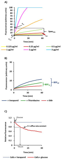 For the efflux assays, the washed cells were resuspended in PBS and the OD600 adjusted to 0.4. The ethidium bromide loaded cells were prepared by incubating the cell suspension in the presence of the highest concentration of ethidium bromide that does not cause accumulation and verapamil at 1/2 (or 1/4) of the MIC at room temperature during 60 min. After EtBr accumulation, the cells were collected by centrifugation at 2940× g during 3 min, room temperature, and resuspended in PBS to an OD600nm of 0.8. Then, 50 µL of the suspension was added to 0.2 mL tubes containing (1) PBS only; (2) PBS plus glucose, to a final concentration of 0.4%; (3) verapamil only; and (4) glucose to a final concentration of 0.4% plus verapamil. The final OD600 of the bacterial suspension in the assay was 0.4. The fluorescence of ethidium bromide was measured, as described above. The fluorescence was acquired first, at the end of 15 s and at the end of every 30 s during the following 30 min. The efflux activity was quantified by comparing the fluorescence data obtained for the cells under conditions that allow maximum efflux (incubation at 37 °C in the presence of glucose and absence of a compound) against the data from the control tube that contains the ethidium-bromide-loaded cells under conditions that inhibit the efflux (with a compound and absence of glucose). The normalized data (Y, fluorescence vs. X, time) was plotted using GraphPad Prism (GraphPad Software, La Jolla, CA, USA) [42]. Ethidium bromide efflux curves were fitted using a single exponential decay equation as follows: , where X is the time, Y is the ethidium bromide efflux that starts at Y0 and decays to the plateau in one phase; the plateau is Y at infinite times. The plateau has the same units as Y and the K or slope is the efflux rate constant.
