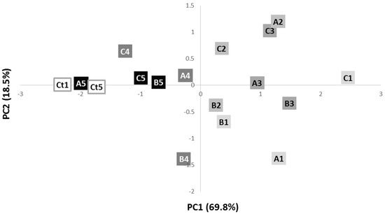 Scores scatter plot of the IR spectra of phage-resistant colonies A, B and C, along the 5 streak plating steps, and control phage sensitive colonies after 1 (Ct1) and 5 (Ct5) streaking steps. The letters correspond to the different colonies (A is colony A; B is colony B; C is colony C) and the numbers to the streaking-plate days (1 is day 1; 2 is day 2; 3 is day 3; 4 is day 4; 5 is day 5).