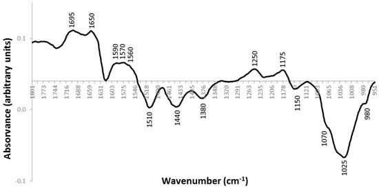 Infrared spectroscopy (IR) has been a valuable method for detection and differentiation of microbial cells. It has also been successfully used to detect modification in proteins and lipids extracted from bacteria after exposure to a stress [21], and to study DNA structure [22]. Another advantage is the possibility of studying the whole cell, without the need to extract cellular components [23,24]. This methodology has already been used to discriminate phage-resistant from phage-susceptible bacteria [15]. The infrared absorbance spectrum represents a “fingerprint” that is characteristic of a chemical or biological substance. The main reasons for the wide acceptance of this method are the speed with which samples can be characterized with almost no handling, the flexibility of the equipment, the minimum sample amount required and the low cost of the analysis [25]. The analytical information from the spectra can be interpreted using a multivariate analysis that relates the spectra obtained with the properties of the object of study, thus facilitating data interpretation [26].