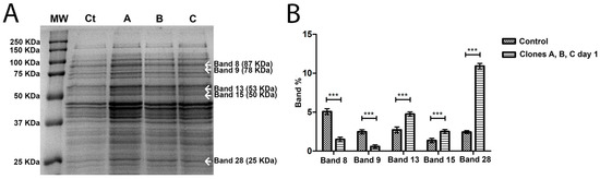 (A) SDS PAGE gel of the intracellular proteins of A. salmonicida on first streak-plating. MW, molecular weight marker; Ct, control phage-sensitive A. salmonicida; A is Colony A of the phage-resistant A. salmonicida mutant; B is Colony B of the phage-resistant A. salmonicida mutant; C is Colony C of the phage-resistant A. salmonicida mutant. The marked bands are the ones that showed differential expression between control and clones A, B and C. Band weight is expressed in kilodalton (KDa). (B) Differential expression of the bands, in percentage, comparing Control (phage-sensitive A. salmonicida) with clones A, B and C (phage-resistant A. salmonicida) after 1 streak-plating steps. *** p < 0.001.