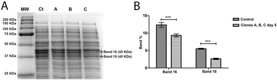 Proteins were separated by 12.5% SDS-PAGE [61], in a Mini-PROTEAN 3 Cell (Bio-Rad, Hercules, CA, USA), for 50 min at 150 V. 5 µg/mL of each protein sample were used in this assay. Proteins were visualized by colloidal Coomassie Brilliant BlueG-250 (CBB) staining [62]. Gel images were acquired using the Gel DocTM XR+ (Bio-Rad, Hercules, CA, USA). The comparative analysis of the acquired images was performed in Image Lab v3.0 software (Biorad, Hercules, CA, USA) and based on the optical density measurement of each band. To minimize possible differences in the quantity of the proteins loaded, the results were normalized and expressed as a band percentage, resulting from the value of the optical density of a given band in the total of the bands per lane × 100. The comparison of the differential expression of the intracellular proteins of the different tested A. salmonicida clones in the different analysis times was made through a two-way ANOVA, using GraphPad Prism software v7 (USA). The differences were considered statistically significant when p < 0.05.