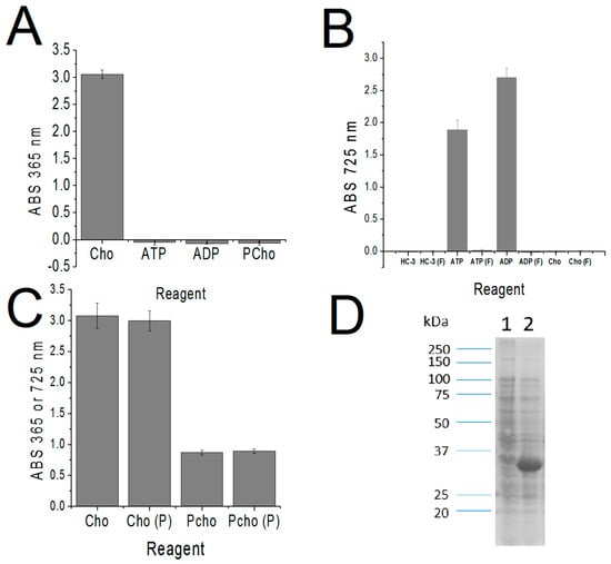 The primary objective of this study was to develop a colorimetric method for detecting the amount of PCho generated from Cho and ATP using a complex protein mixture as the Chok source. As a model, we selected the sChok expressed in E. coli []. The S. pneumoniae LicA gene overexpressed well in BL21(DE3) cells (Figure 1D). The SDS-Page analysis clearly showed a strong band at around the expected size (35.5 kDa) in the induced sample, indicating that Cho kinase was overproduced against a background of endogenous proteins.