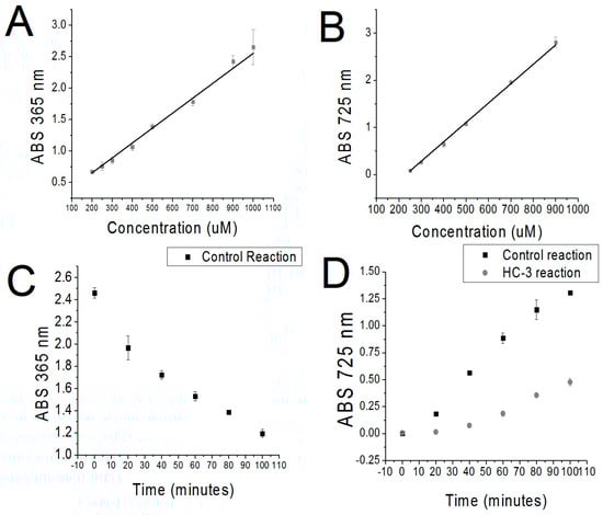A time course of enzymatic activity was performed over a period of 100 min using cell extracts of sChok overexpressed in BL21 (DE3). Samples were taken every 20 min. In addition, a second time course was performed using HC-3, a known inhibitor of sChok [], for comparison purposes. A second objective of this study was to demonstrate that this system was a viable method for drug screening against bacterial Chok enzymes. A linear reduction of Cho was observed over time in parallel with an observed increase in PCho (see Figure 2C,D). Quantification of Cho and PCho demonstrated that the two separate measurements corresponded with minor deviations when the concentration of Pcho was inferred from the concentration of Cho (see Table 1, [PCho] vs inverse [Cho]). Cho quantification was confounded in the case of the reaction containing HC-3 because this compound precipitated alongside Cho in the triiodide step. Nevertheless, HC-3 was no longer present in quantities that interfered with the MBD step (See Figure 1B). This meant that PCho could be reliably measured even when HC-3 was included in an enzymatic reaction. However, Cho could not be measured in the case HC-3 was added to the reaction. As a final validation step, the concentration of Cho and PCho found at 60, 80, and 100 min time points was measured by mass spectrometry (MS). MS values were found to be comparable to the colorimetric values. The results of the MS assays also confirmed that the catalysis of choline was inhibited in the presence of HC-3 (Table 1). Consequently, overall, this colorimetric method could be considered to be validated.