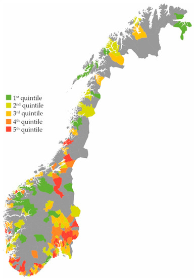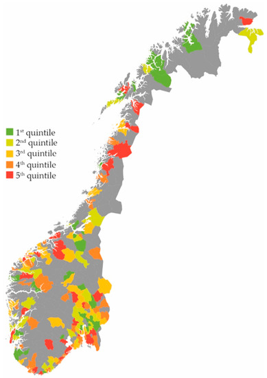 RTI consultations per 1000 inhabitants in 198 Norwegian municipalities. Quintile 1: 158–263 consultations. Quintile 2: 266–293 consultations. Quintile 3: 294–314 consultations. Quintile 4: 315–344 consultations. Quintile 5: 344–412 consultations [13].