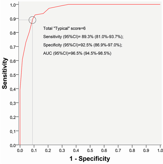 Discriminative ability of the “Typical” domain was evaluated using Receiver-Operating-Characteristic (ROC) curve analysis (Figure 1). Changes in predictive ability of the questionnaire depending on scores in “Typical” domain showed that the most appropriate cut-off summary score for the “Typical” domain was equal to 6 (Table 1). Among 107 women with confirmed AC, 99 (92.5%) had a summary score of 6 and higher (true-positive result), and only 8 women (7.5%) with approved AC had a score less than 6 (false-negative result). Among the group of 121 women who did not have AC, the false-positive result was noted in 13 cases (10.7%) (false-positive value), and the true-negative result (<6) was reported for 108 women (89.3%). These results were similar to those published earlier, when the first 58 patients having filled in the precursor version, USQOLAT, were also included in the analysis (Table 2). A scatter plot chart according to a summary score of the “Typical” domain at visit 1 including 228 subjects (107 patients with AC, 121 controls without AC) is given in Figure 2.