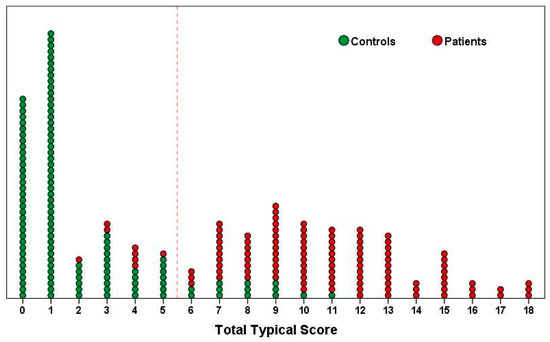 Distribution of 228 subjects (107 patients with AC, 121 controls without AC) according to a summary score of the “Typical” domain of the ACSS at the first visit.