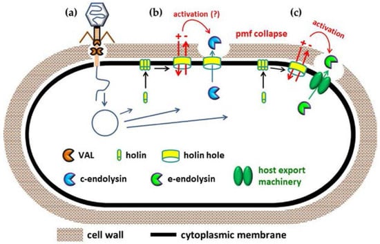 Endolysins are produced in the cytoplasm of infected cells and need, therefore, to overcome the CM barrier in order to reach the CW and exert their lytic action. These enzymes can be generally classified in canonical endolysins (c-endolysins) or exported endolysins (e-endolysins), depending on the pathway they follow to reach the CW. In the first case, endolysins require the action of a second phage-encoded function, the holin, to be able to escape the cytoplasm. Holins build and oligomerize in the CM, and at a genetically programed time they are triggered to form holes, which cause the lethal collapse of the CM proton-motive force (pmf) [33]. Additionally, these holes are large enough to allow escape of the cytoplasm-accumulated c-endolysin to the CW, which is an essential requirement for occurring lysis. This mechanism defines the so-called canonical lysis model and is prototyped by Escherichia coli phage λ [33] (Figure 1b). The endolysins that have been explored as enzybiotics are c-endolysins.