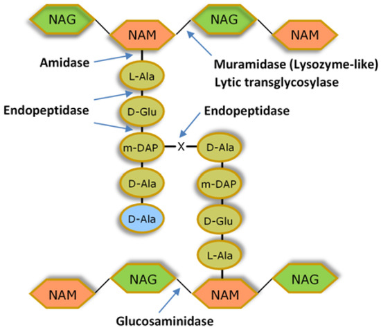 The antibacterial potential of PLEs resides in their capacity to cleave different bonds of the CW peptidoglycan network. The murein polymer has as repeating unit a disaccharide made of N-acetylglucosamine (NAG) and N-acetylmuramic acid (NAM), linked by glycosidic bonds β (1 → 4). Neighbouring glycan strands are cross-linked by penta/tetrapeptide side stems that are attached to NAM via amide bonds. The most frequent type of cross-linking involves the amino acid residues at positions 3 (often L-Lys or meso-diaminopimelic acid (m-DAP)) and 4 (D-Ala) of adjacent peptide chains. The peptide stems are interconnected by a direct interpeptide bond in most Gram-negative bacteria and few Gram-positive species, whereas peptide chain cross-linking occurs via an interpeptide bridge in the majority of Gram-positive bacteria. The different peptidoglycan types among bacteria derive mostly from variations within the peptide moiety, notably in the amino acidic composition of the interpeptide bridges [11,37] (Figure 2).