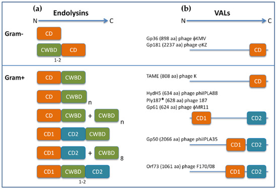 Domain architecture of endolysins (a) and VALs (b) that have been explored as enzybiotics, from Gram-positive and Gram-negative systems. CD, catalytic domain; CWBD, cell wall binding domain. The cardinals indicate the copy number of CW binding motifs composing the CWBD. The “n” letter indicates that a variable number of CW binding motifs may compose the CWBD (2 to 7 copies). These may be present either as tandem repetitions (in monomeric enzymes) or as oligomers when the CWBD subunit is independently produced by in-frame, alternative start sites (see text). The subunits of hetero-oligomeric endolysins are separated by the “+” sign. The presented VALs are from phages infecting Pseudomonas aeruginosa [56,57], S. aureus [58,59,60,61], and E. faecalis [62]. * Ply187 was firstly described as an endolysin. Schemes of phage lytic enzymes are not drawn to scale.