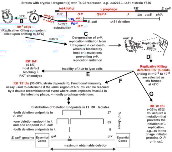 The induction lethality phenotype for non-excisable prophage was termed Replicative Killing []. Accordingly, starting cells with de-repressible, but non-excisable prophage, as in Figure 1A and B, are termed RK+ (Replicative Killing competent) cells and the selected survivor cells that form CFU at 42 °C were named Replicative Killing defective (RK−) mutants (Figure 1C–G). The concept evolved that the starting cells possess the capacity for λ replication initiation upon prophage induction, whereas the survivor clones do not. The results of these early studies were reviewed []. Only a few mutations conferring the RK− phenotype for survivor CFU derived from the PDS selection or those from the N+ λ fragment strains (an example is shown in Figure 1) have been characterized by DNA sequence analysis. Most all the RK− mutants were obtained before the possibility for PCR amplification of a mutated region of the chromosome, which enables direct sequence determination of the RK− mutation. Hence, those RK− mutations that have been characterized depended mainly upon genetic analysis using phage mapping and complementation.