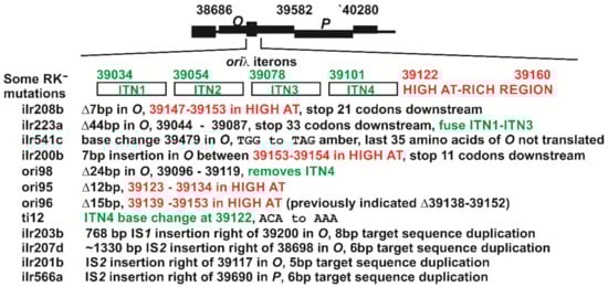 RK− ilr mutations characterized within λ genes O-P. The minimal oriλ size was suggested to include a HIGH-AT-rich region to the right of four iteron sequences, ITN’s1-4 [,], which each contain an 18 bp inverted repeat of hyphenated symmetry, joined by adenine residues that can cause oriλ to assume a bent structure []. The mutants shown designated ori95, ori96 and ori98 were obtained from WD from prophage with r-mutants r-95, r-96, and r-98. Note that Denniston-Thompson, et al., [] sequenced the r-mutants r-99, r-96 and r93 which represent Δ12 bp (39120–39131), Δ15 bp (39138–39152) and Δ24 bp (39092–39115) []. Our sequence localization for ori96 (r96) differs by one bp from that assigned in [].