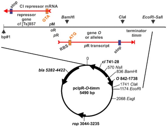 The O gene alleles were amplified from E. coli strains with a prophage (e.g., each of the RK− mutants shown in Figure 2) or λ phage DNA, using PCR primers L-Bam-O and R-ClaI-O. The PCR fragments were cloned just downstream of promoter pR between the BamHI and ClaI restriction sites in the pcIpR-(…)-timm plasmid isolated from a dam host strain, as drawn in Figure 3. The R-ClaI-O primer introduces an ochre stop codon at the COOH-terminal end of O. Primers L-Bam-P and R-ClaI-P were used for to clone gene P. Primers L-Bam-O and R-ClaI-P were used to clone genes O-P, which include the natural TGA stop codon for O and an ochre codon terminating P. The construction of plasmids pcIpR-P-timm, pcIpR-O-timm, pcIpR-O-P-timm, pcIpR-O-36P-timm, pcIpR-O-63-P-timm, pcIpR-oop#1-timm, and pcIpR-oop#2-timm was as reported in []. The plasmids oop-O and oop-O-P, Table 2, were constructed using primers L-Bam-oop#1 or L-Bam-oop#2 and R-ClaI-O to make oop-O and R-ClaI-P to make oop-O-P and the PCR fragments were cloned between the BamHI and ClaI restriction sites in the unmethylated pcIpR-(…)-timm plasmid. Plasmid O-SPA was constructed by removing the BamHI-P-AscI fragment from pcIpR-P-SPA-timm [] and inserting the fragment BamHI-O-AscI prepared using primers L-Bam-O and R-O-AscI. This construct is described in footnote “f” of Table 2. The DNA template used for amplifying wild type alleles of oop-O-P was from λcI857 [].