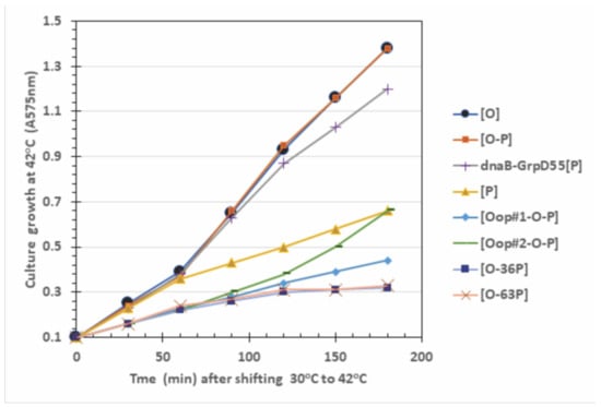 Influence of induced O, P gene expression on cell growth at 42 °C. All the strains were made by transforming hosts 594 or 594 dnaB-GrpD55 with pcIpR-(‥)-timm plasmids that included the cloned O, P DNA fragment, and selecting the transformants on LBAmp50 agar (medium composition is described in footnote to Table 3). The plasmid inserts in each CFU employed were verified by DNA sequence analysis. Cells were inoculated from overnight cultures grown up overnight in LBAmp50 broth and then 0.4 mL of culture was added to triplicate 20 mL fresh LB cultures that were incubated at 30 °C for ~30 min to reach an A575 = 0.1. Upon reaching an absorbance of 0.1 the cultures were transferred to a shaking 42 °C water bath. Aliquots were sampled every 30 min for 3 h. The average absorbance is shown, with a standard error for each culture time of less than 5% the averaged absorbance value.