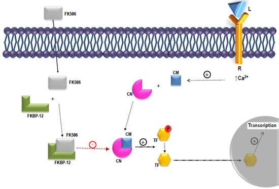 Mechanism of action of tacrolimus (FK506). Tacrolimus interacts with cytosolic receptors such as FKBP12. The complex FKBP12-FK506 inhibits the calmodulin-dependent serine/threonine phosphatase activity of calcineurin. In this situation, calcineurin can no longer dephosphorylate transcriptional factors (e.g., NFAT). The dephosphorylated TFs are required for governing T cell proliferation. L: ligand; R: receptor; CM: calmodulin; CN: calcineurin; TF: transcription factor; P: phosphate group; FKBP-12: FK506 binding protein 12.