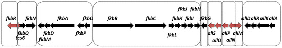 The use of tiling probes covering the fkb cluster allowed the identification of 6 transcriptional units: fkbR, tcs6-fkbQ-fkbN, fkbOPADM, fkbBCLKJIH, fkbG and allAKRD. It was concluded that fkbR is transcribed as a leaderless mRNA and that fkbN forms an operon along with tcs6 and fkbQ whose transcription depends on two different promoters, one FkbN-dependent and the other FkbN-independent [38]. These results are supported by the EMSAs performed with the FkbN-DNA binding domain in S. tsukubaensis L19 by Zhang and coworkers [75], who reported FkbN binding to the promoter regions of the same six transcriptional units and identified two new ones corresponding to allNPOS and allM. More recently, differential RNA-seq (dRNA-seq) transcriptional profiling has been performed in S. tsukubaensis by Bauer and coworkers [39], who identified 9 transcriptional units that are in good agreement with previous studies (Figure 2). The main finding is that allOS and allNP are transcribed as independent mRNAs [39].