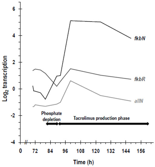 Transcriptional profiles of genes encoding transcriptional regulators of the fkb cluster. Transcription of fkbN, fkbR and allN in S. tsukubaensis NRRL 18488 grown in MGm-2.5 production media. As indicated in the graph, phosphate depletion occurs between 80 h and 89 h and tacrolimus is detected from 89 h. The cultures were performed in duplicated flasks. Error bars have been omitted to facilitate the visualization of the results.