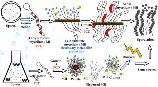 One of the most important characteristics of Streptomyces is its complex life cycle, which is closely related to secondary metabolite production [] (outlined in Figure 1). In solid sporulating cultures, development starts with spore germination and the rapid development of compartmentalised hyphae into the medium (early substrate mycelium or MI) []. After that, programmed cell death (PCD) occurs (red cellular segments in Figure 1) which triggers the differentiation of the multinucleated (MII) antibiotic-producing hyphae (late substrate mycelium, early MII) [,]. Then, the mycelium starts to grow into the air forming the aerial mycelium (late MII). At the end of the cycle, there is a second round of PCD, and most of the remaining viable hyphae undergo a process of compartmentalisation that culminates in the formation of unigenomic spores [].