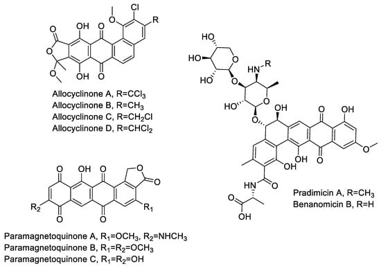 Overall, this brief survey of aromatic polyketides indicates that Actinoallomurus spp. are capable of producing decaketides (i.e., paramagnetoquinones), undecaketides (i.e., allocyclinones, presumably undergoing oxidative ring cleavage after polyketide formation) and dodecaketides (i.e., pradimicin and benanomicin). The structures of these metabolites are shown in Figure 2.