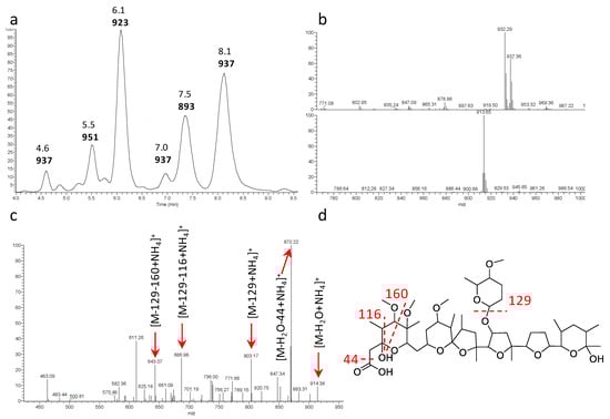 Analysis of α-823. (a) Base peak chromatogram of the 4.0–10.0 min portion with retention times and m/z [M+MH4]+ values. Data obtained with a partially purified extract of Actinoallomurus sp. ID145823 (see Table S1 and Figure S7 for the congeners comparison); (b) mass spectrometry (MS) at 8.1 min in positive (above) and negative (below) ionization mode; (c) MS2 analysis of m/z [M+NH4]+ 932; (d) putative fragmentation pathway for α-823.
